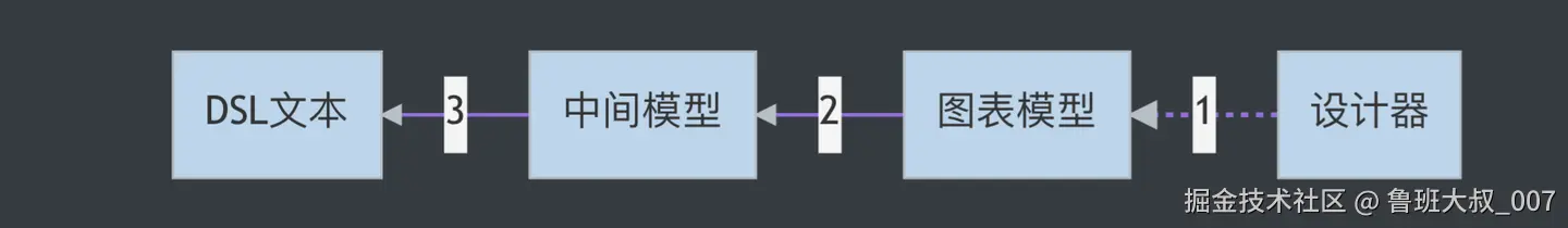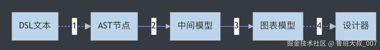 但是弊端也很明显就是实现成本高设计器很复杂,从dsl文本到设计器图表需要4个转换步骤: