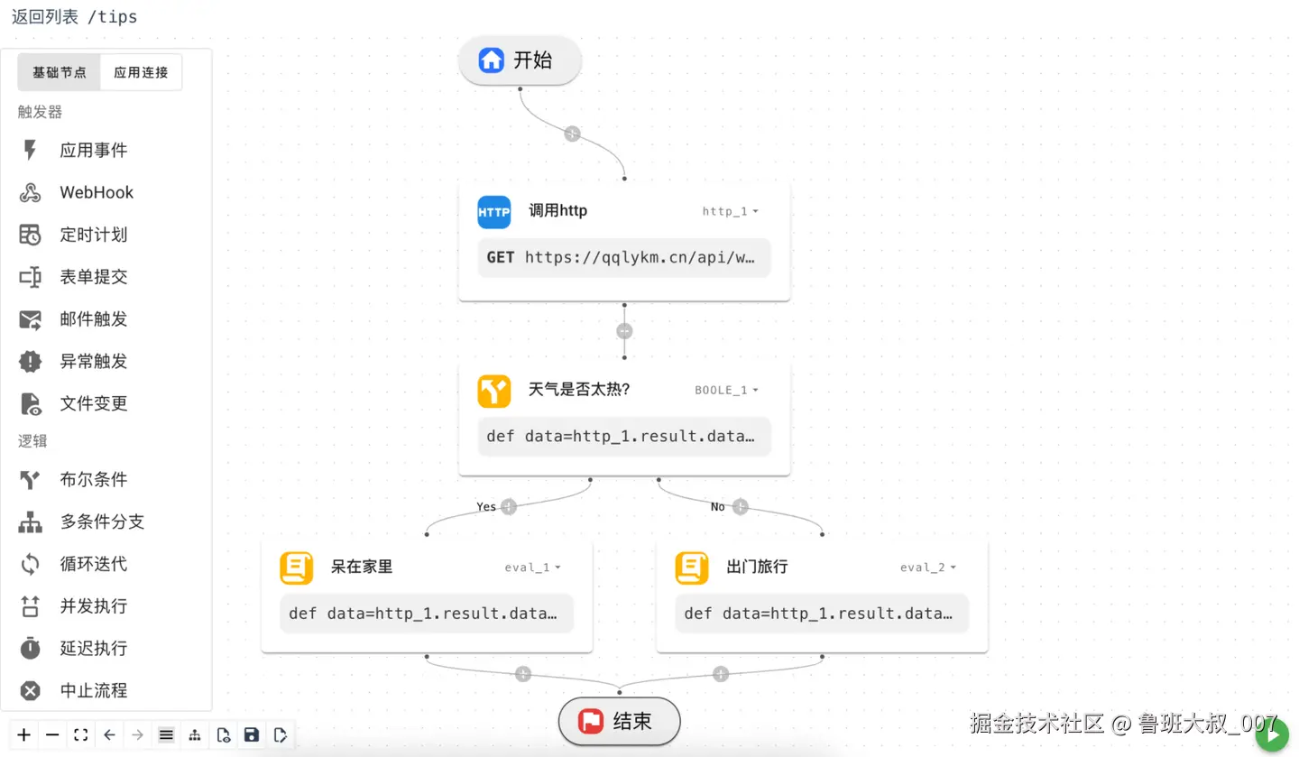 首先通过拖拽生成一个流程如下图,他调用一个API获取天气信息,然后判断天气是否太热(大于26度),根据判断返回不同的建议信息。