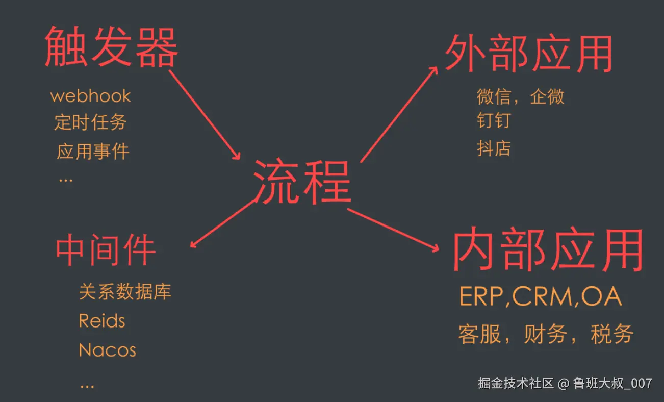 如上图所示编排系统由5个关键点组成,其核心是流程,通过触发器进入流程引擎,接着在引擎中调用、内部外部应用 以及中间件来实现业务。