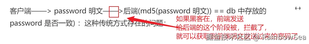 客户端——> password 明文——>后端(md5(password 明文)) == db 中存放的 password 是否一致) :这种传统方式存在的问题: