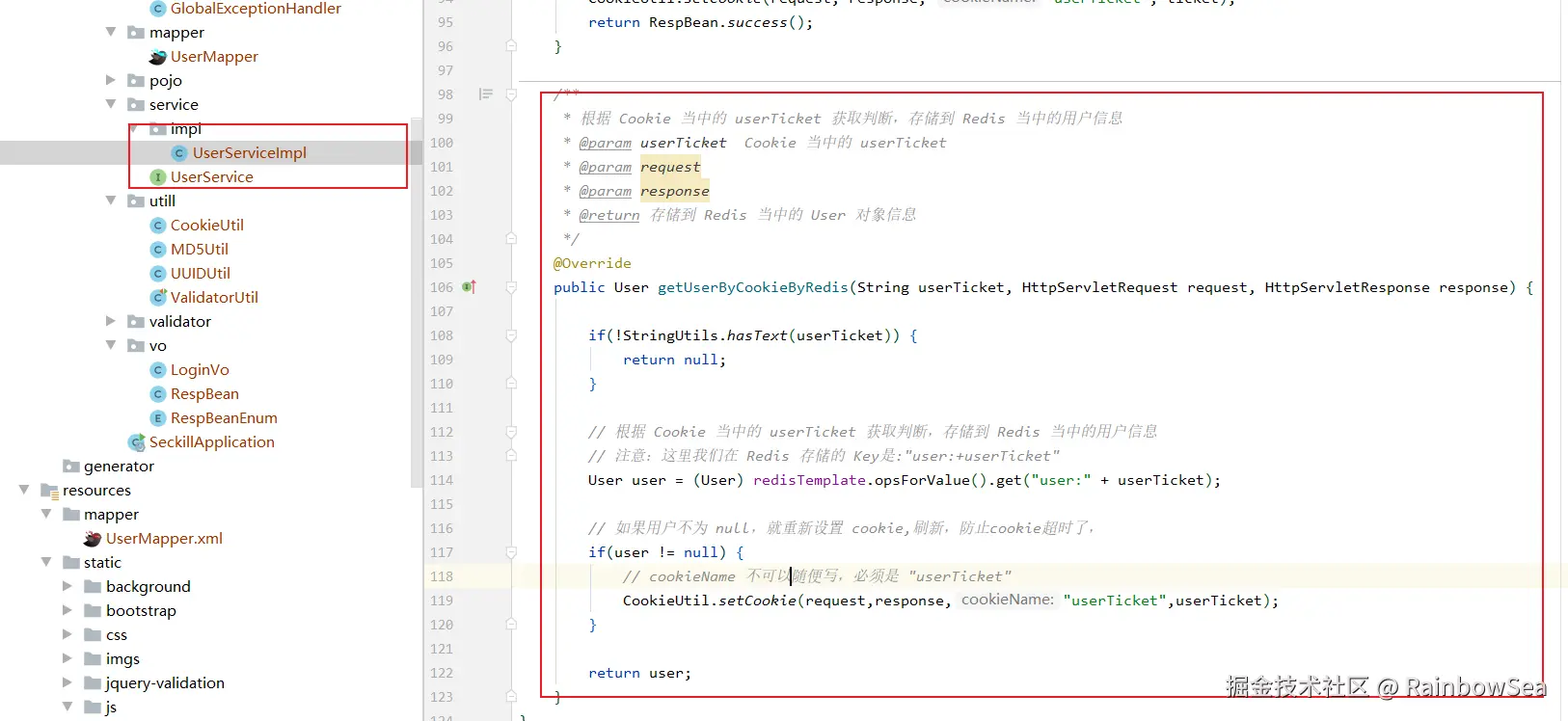 // 根据 Cookie 当中的 userTicket 获取判断,存储到 Redis 当中的用户信息