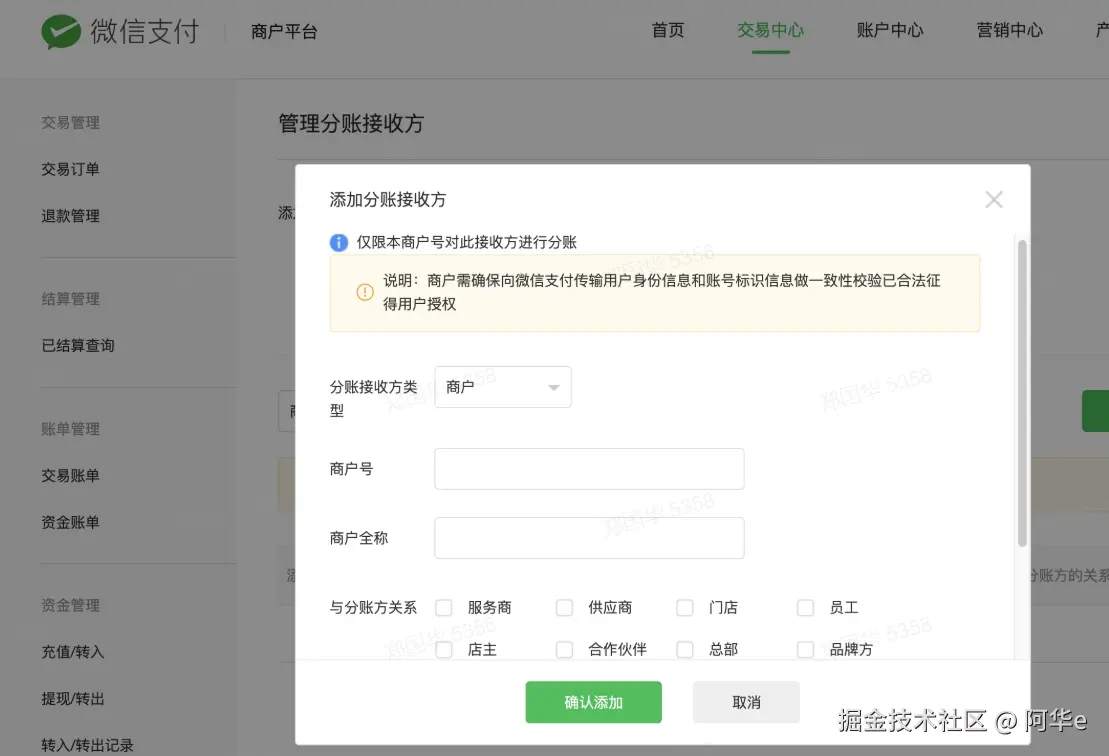 1:分账商户后台 添加对应的分账方,也可以用通过相关api调用添加对应的分账方: