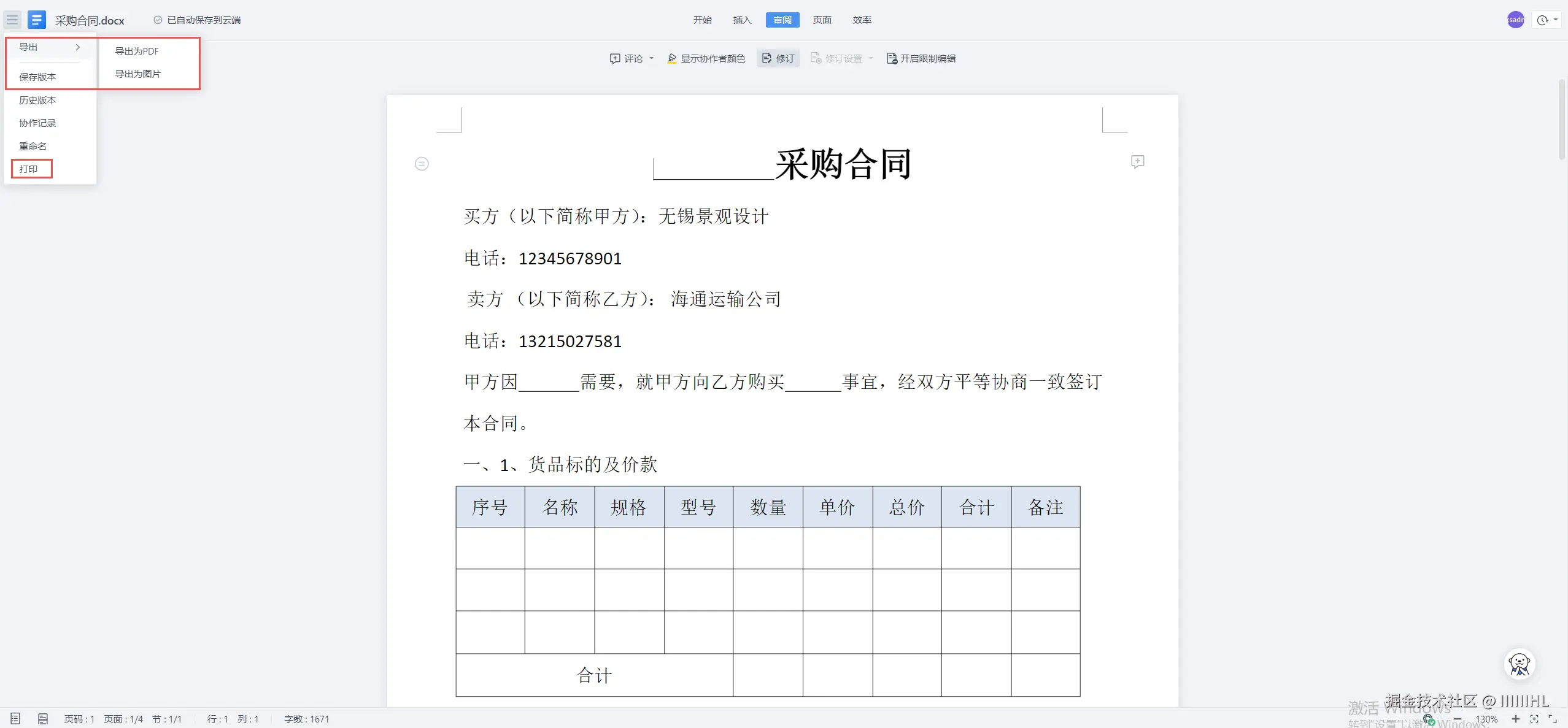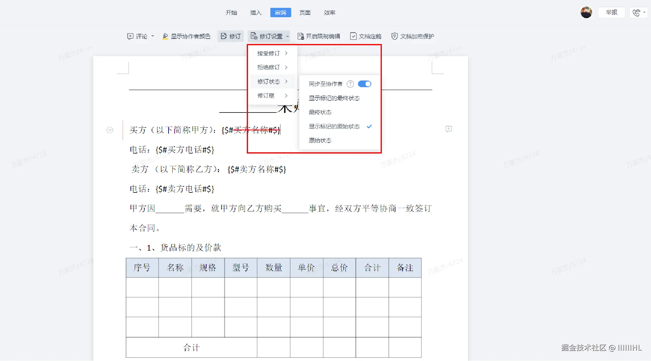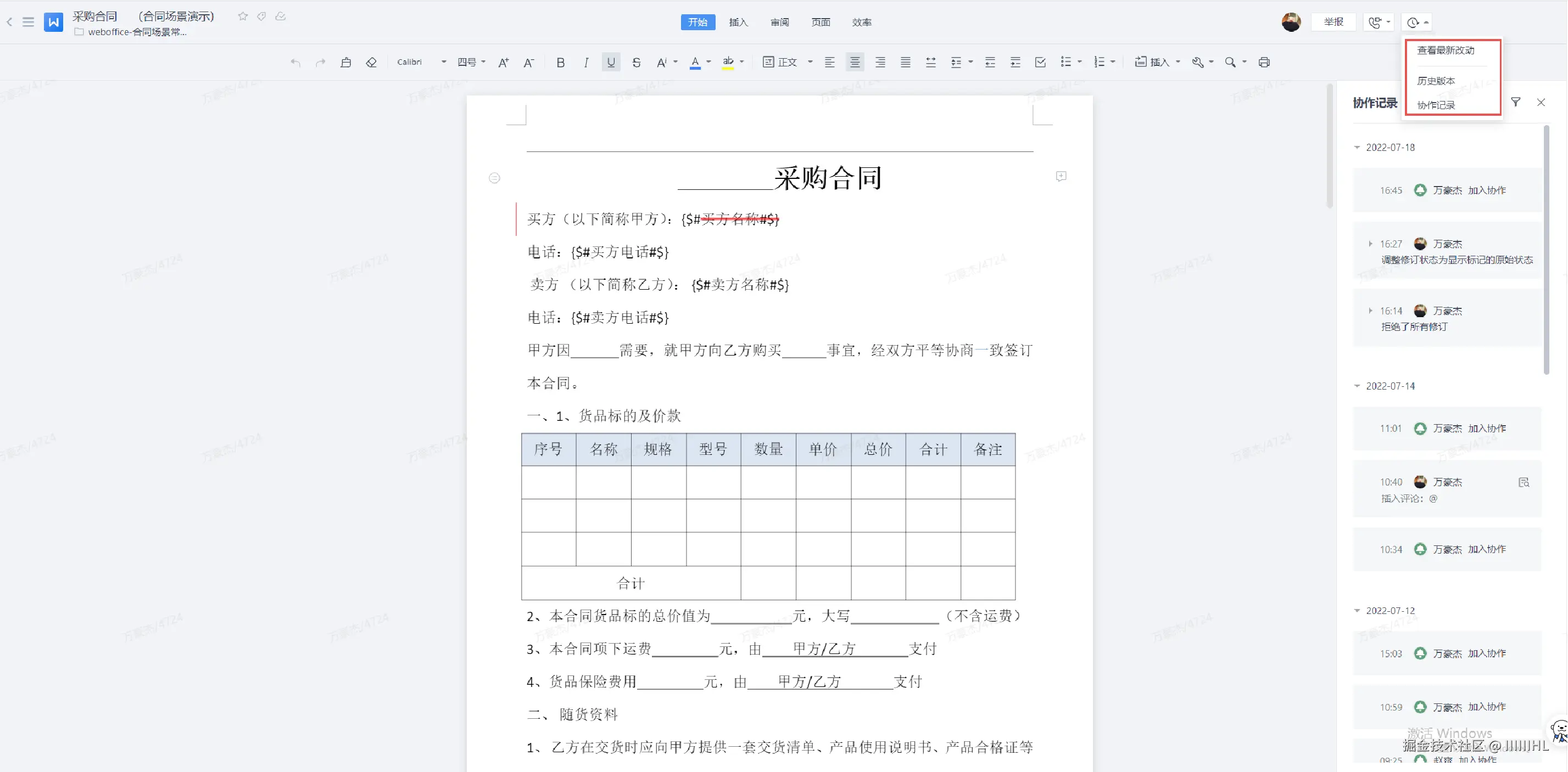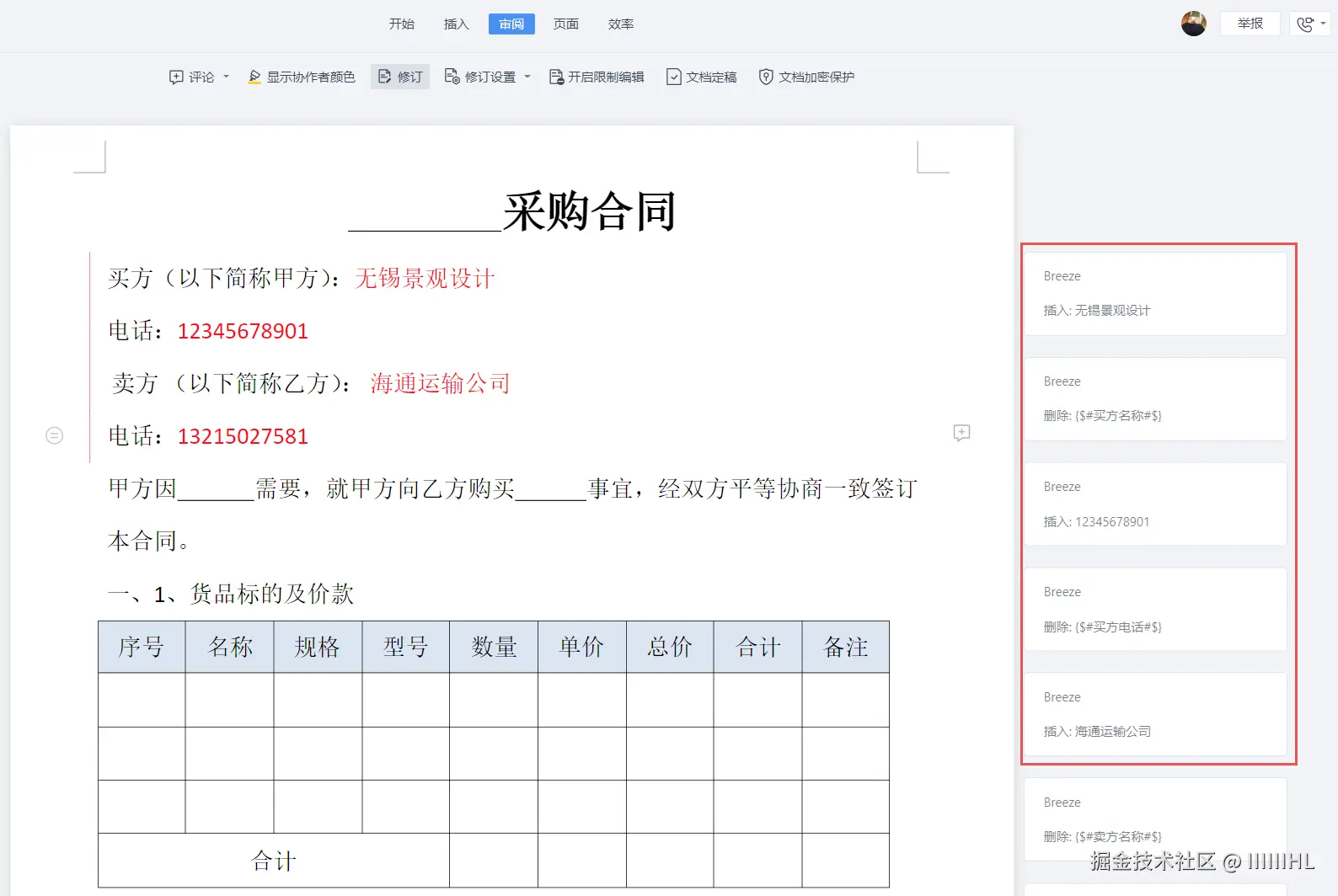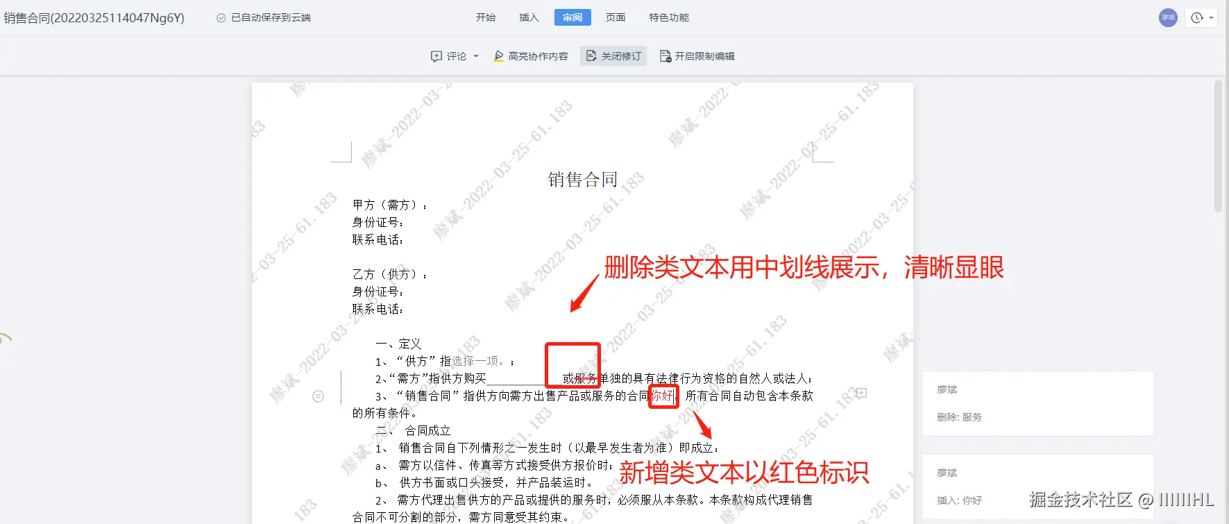 进入修订模式后,修订记录的展示效果如下,在合同审批阶段,起草过程中对合同做的修改痕迹都会在文本中直观显示。