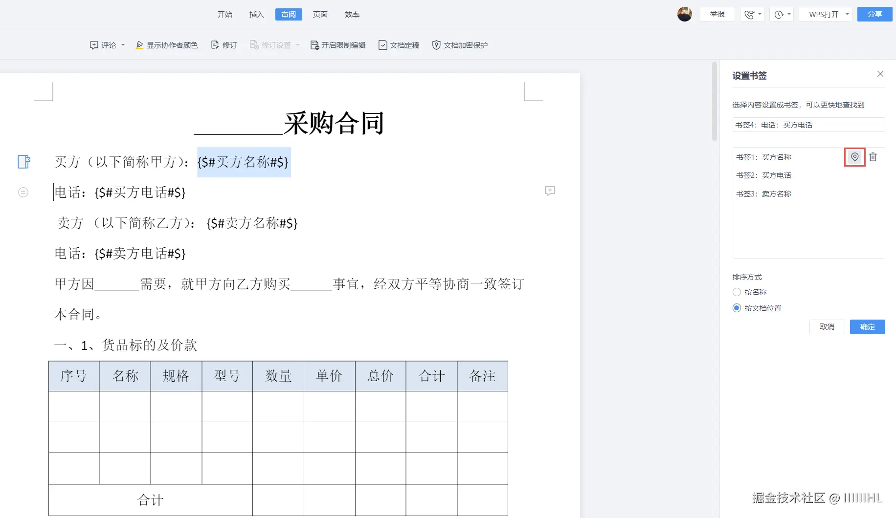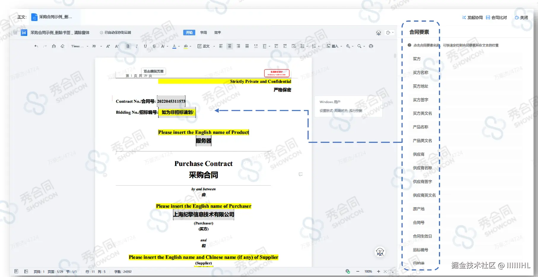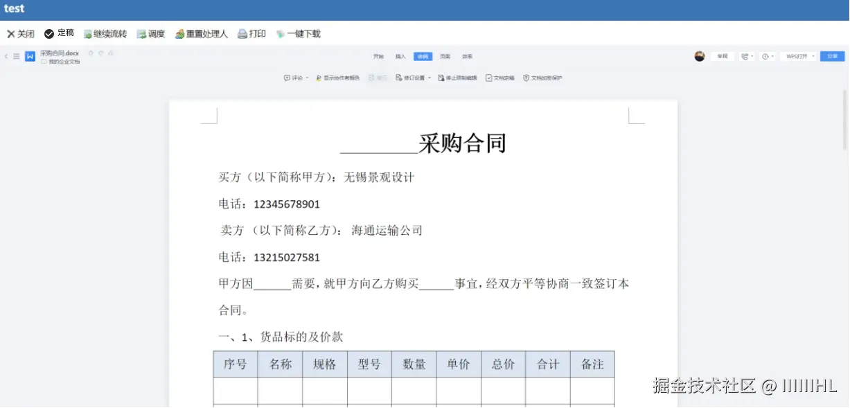 该类合同适用于格式合同内容自动填充的场景,一般不会对合同固定内容进行修改,利用weboffice在线编辑能力,在制作标准合同模板过程中插入书签,便于后续内容匹配自动填充。