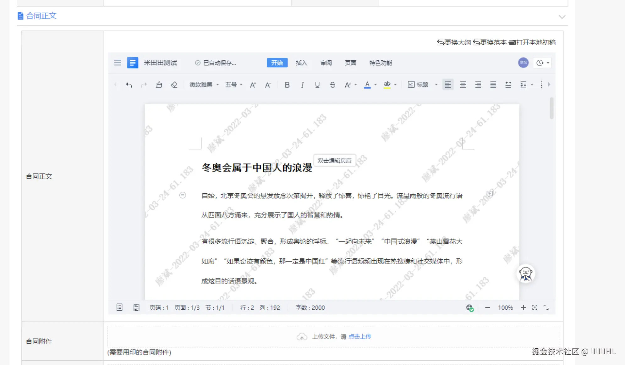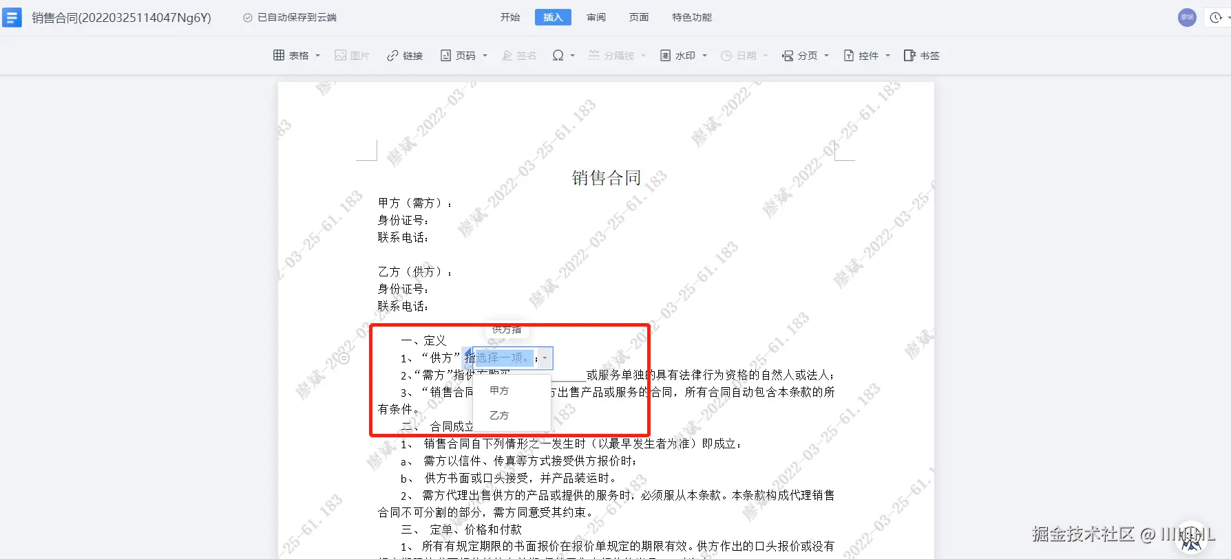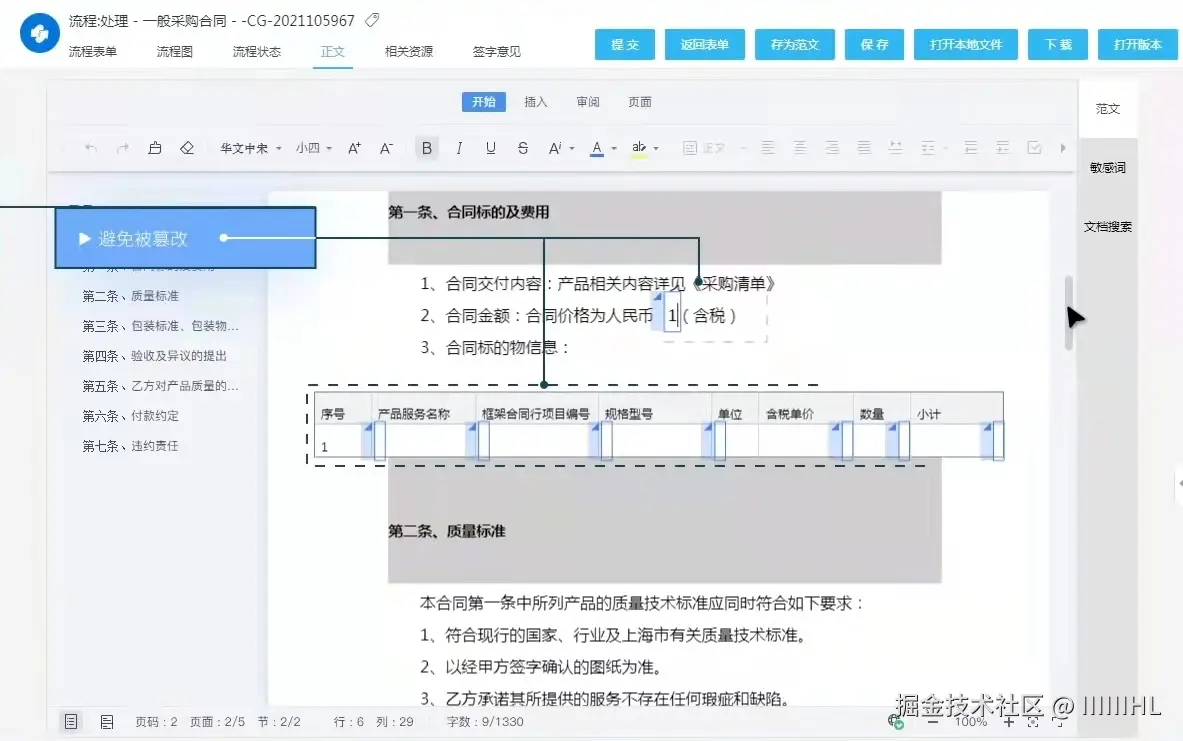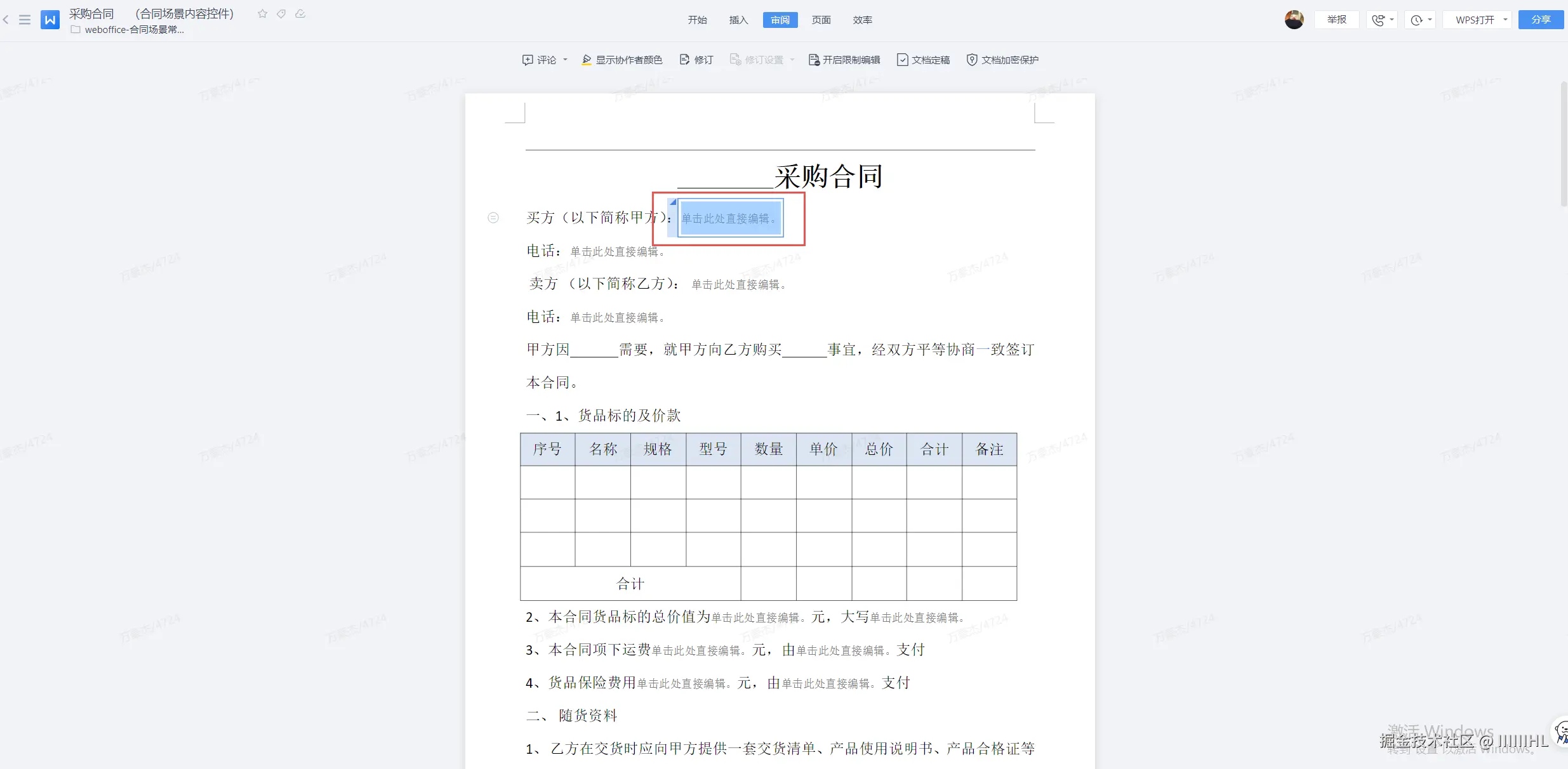 内容控件与书签内容替换方案区别点在于,如果涉及到编辑限制场景:可以利用内容控件框定编辑区域,限制输入的内容,该类合同中会存在较多标准化的条款(如法务类约定)只能由特定审批人可以修改,为防止合同内容被篡改,可以通过添加内容控件配合限制编辑功能,实现限制用户只能修改指定位置内容。