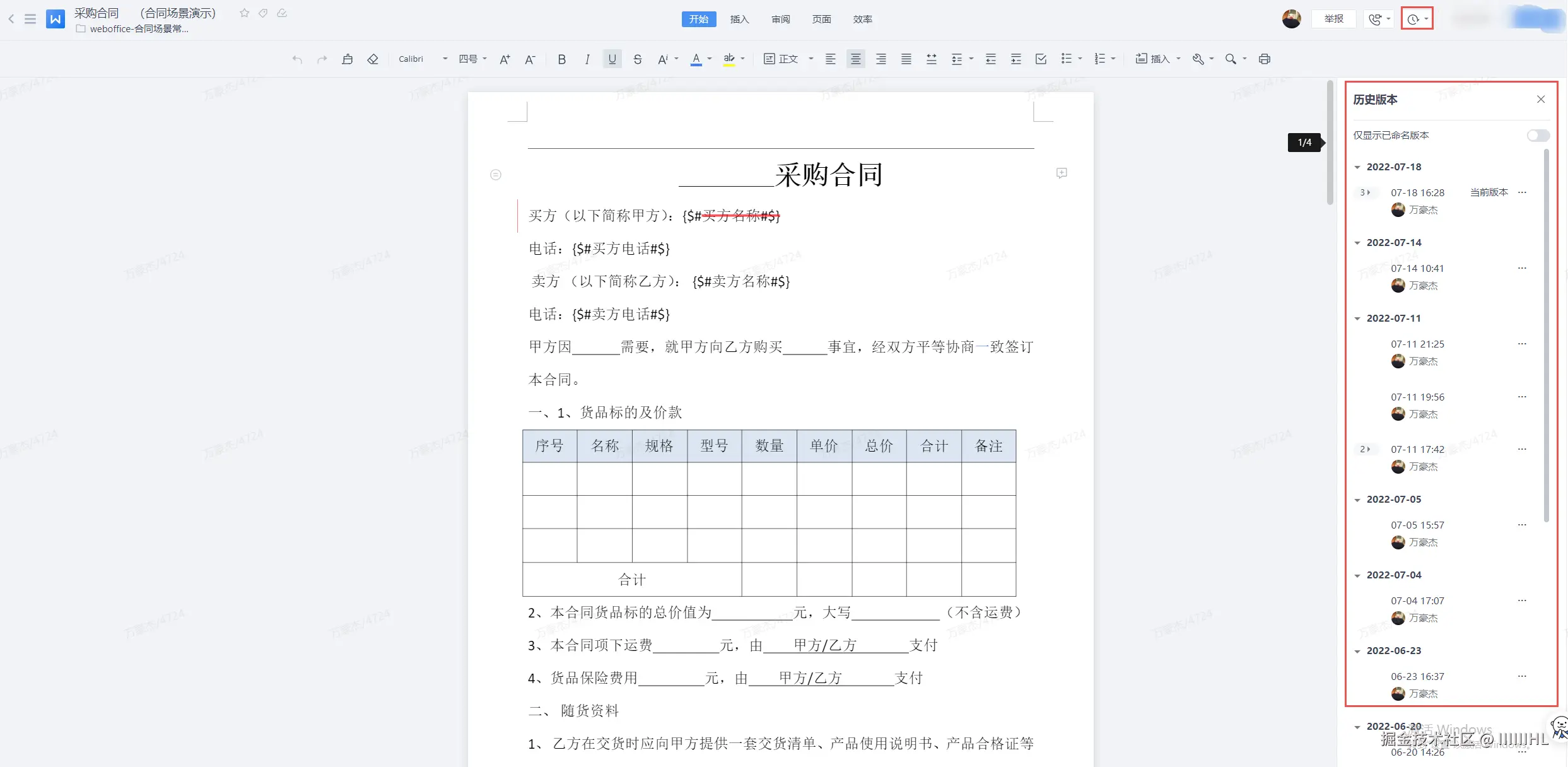 解决了文档权限变更之后,可以通过合同文档修改记录与历史版本存档功能便于修改溯源,提高审核的效率: