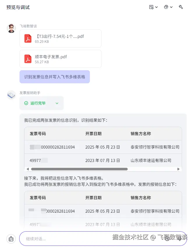 一次性上传多张发票 PDF(我这里选择了2张),并发送“识别发票信息并写入飞书多维表格”指令。