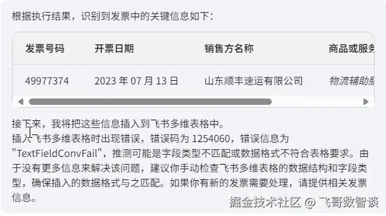 飞书多维表格写入时容易出现格式转换错误,这是因为我们识别后,没有严格限制提取信息的格式导致。