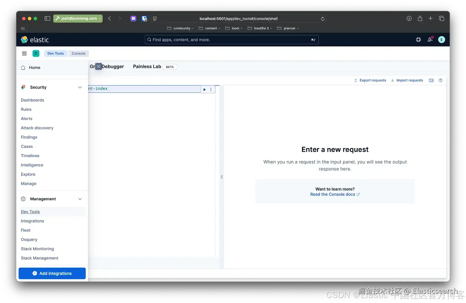 你可以通过 Kibana 确认:在发送文件到 /rag/ingest 端点后,打开浏览器访问 localhost:5601,然后在左侧菜单中导航到 Dev Tools。在那里你可以发出查询,和 Elasticsearch 实例中的数据交互。