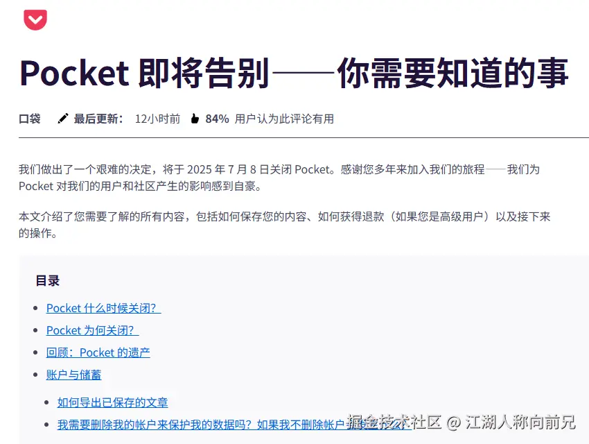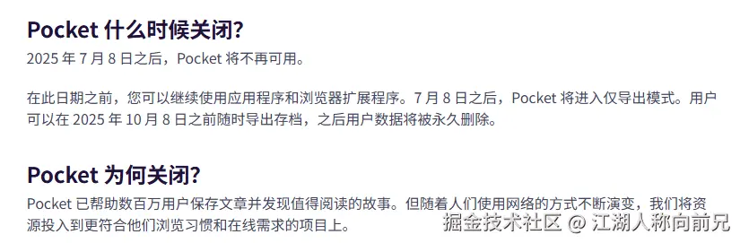 昨天看到一条消息,全球最大的“稍后读”应用 Pocket 宣布将于2025年7月8日关闭服务,其数据也将在 10月8日永久删除。