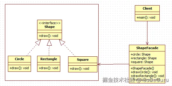 我们将创建一个 Shape 接口和实现了 Shape 接口的实体类。下一步是定义一个外观类 ShapeMaker。