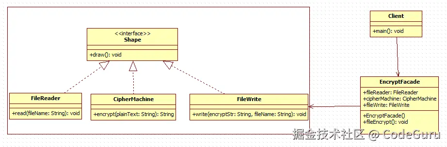 Client: 客户类,通过外观类,得到我需要的。我就是要将一个没有加密的文件,读取以后进行加密然后保存