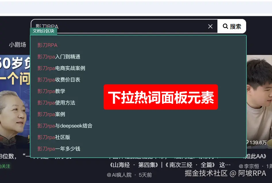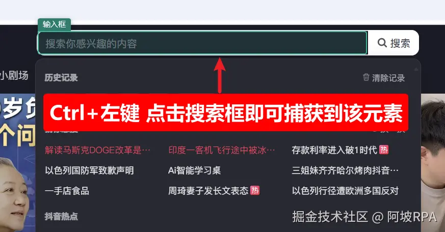 同样操作方法,鼠标悬浮到下拉面板区域后,如下图所示,Ctrl+左键 点击,即可捕获后,再点击✓,完成元素捕获。