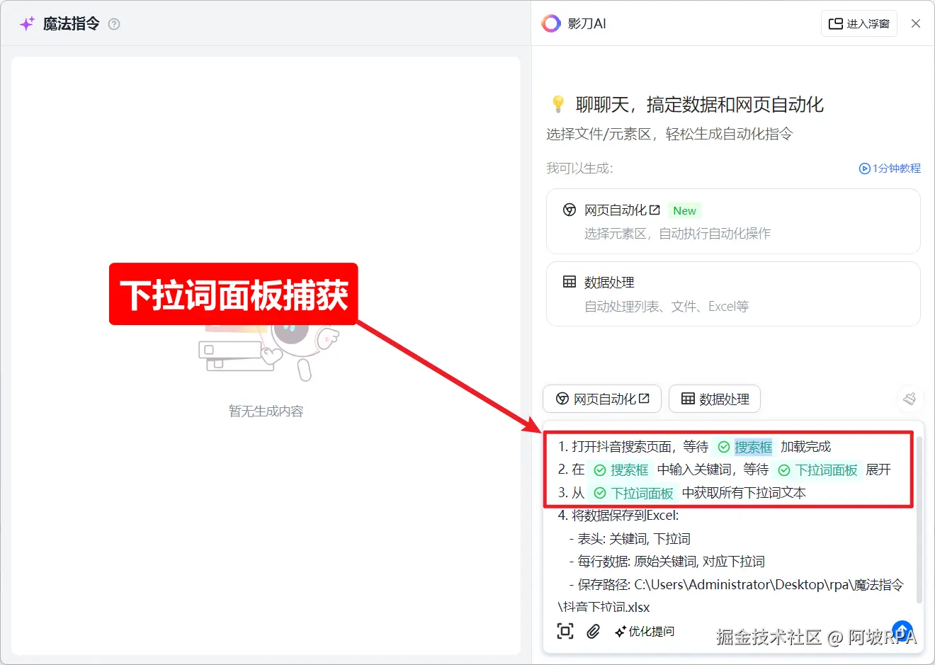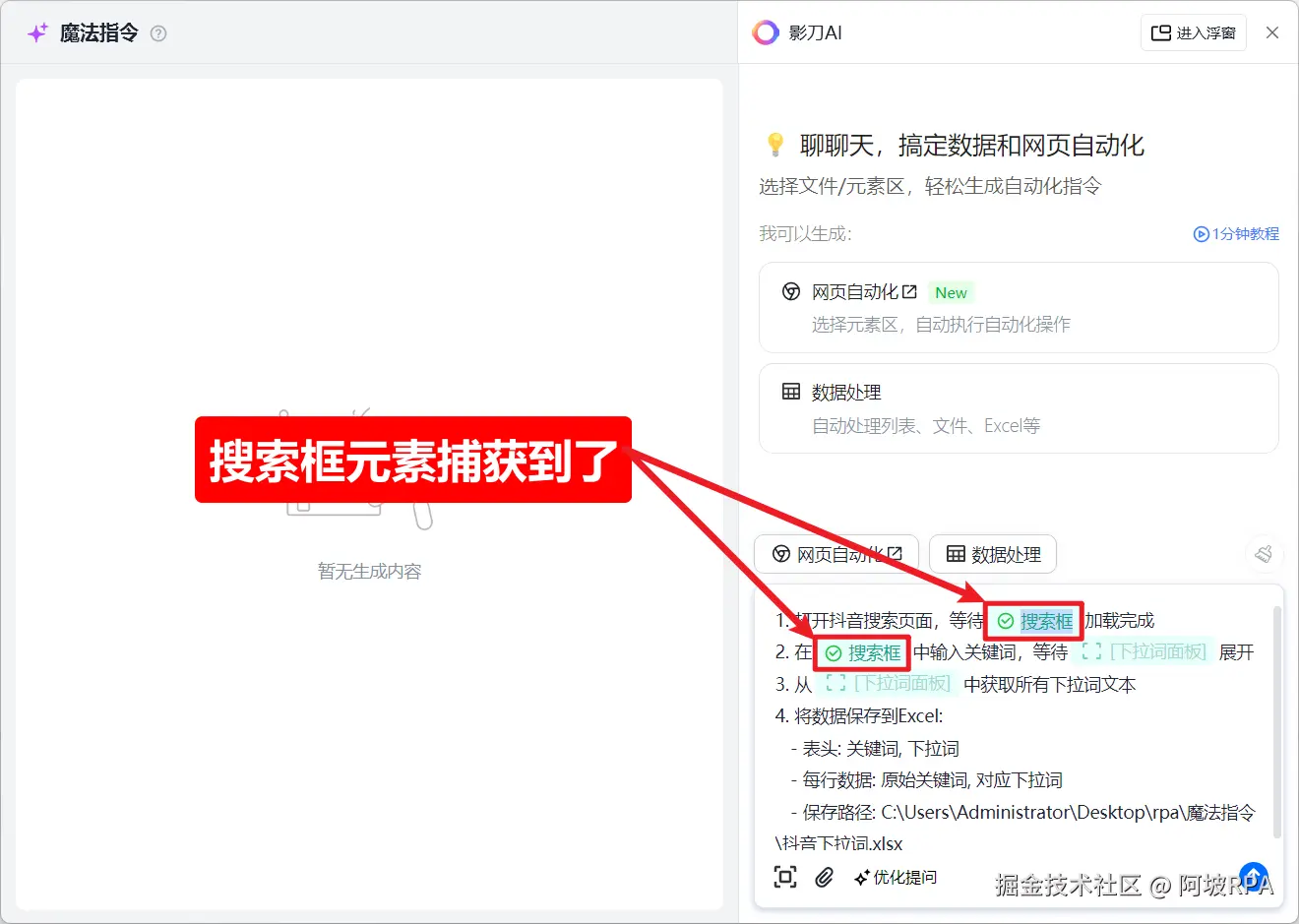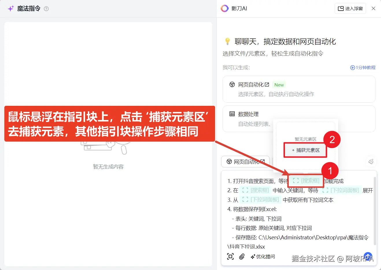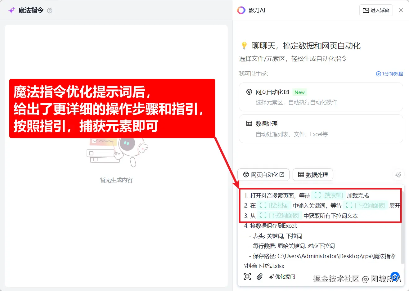 通过让魔法指令对提示词进行第二次的优化后,会看到更具体和落地的操作指引,按照指引捕获元素即可
