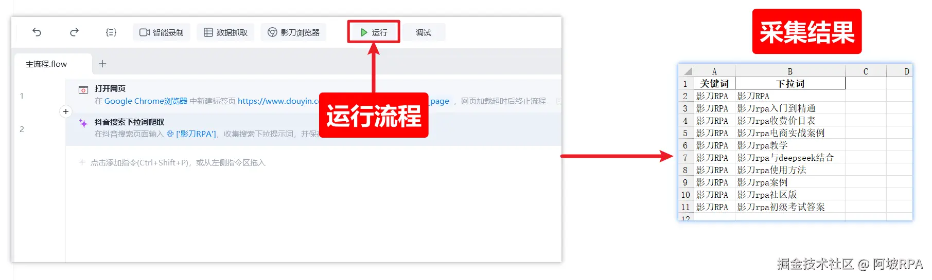 我尝试了一个以前搭建过的流程:采集抖音下拉热词