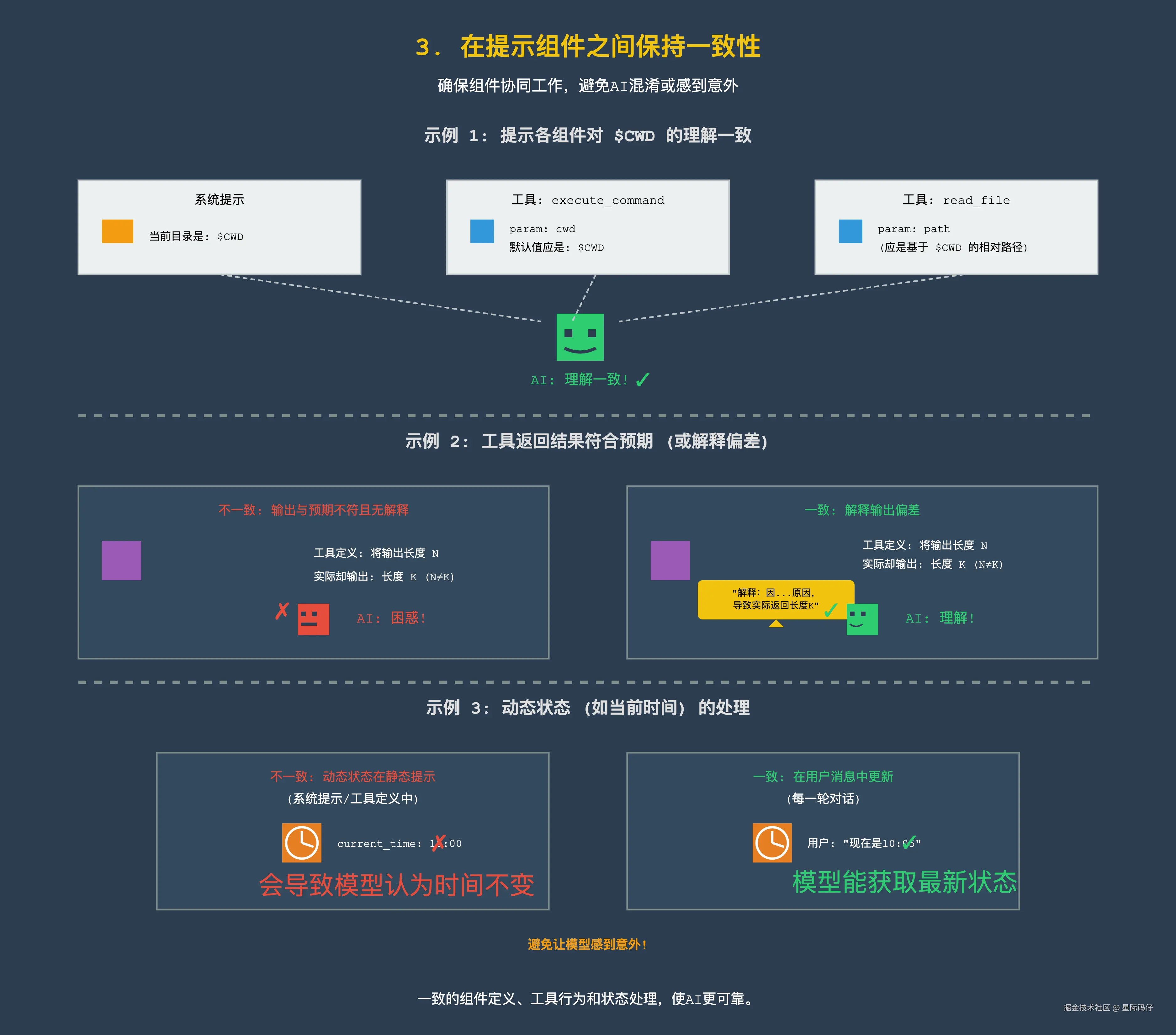 要确保提示的各个组成部分,比如前面提到的系统提示、工具定义等,都要保持一致,**** 避免出现前后矛盾或含糊不清的地方。