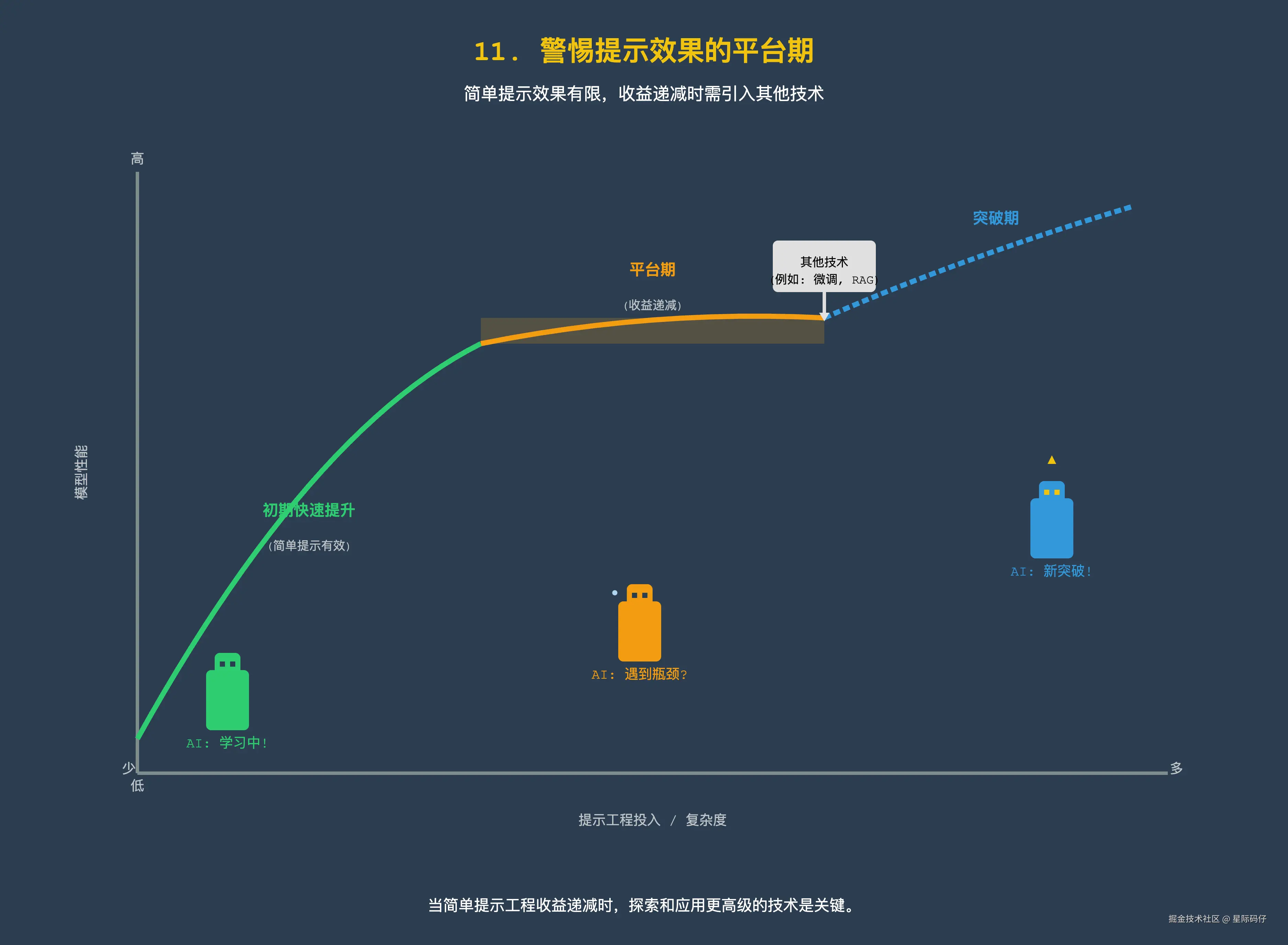 当你发现,无论怎么优化提示,效果提升都微乎其微,也就是进入了所谓的“收益递减”阶段时,就需要引入其他更高级的技术了。