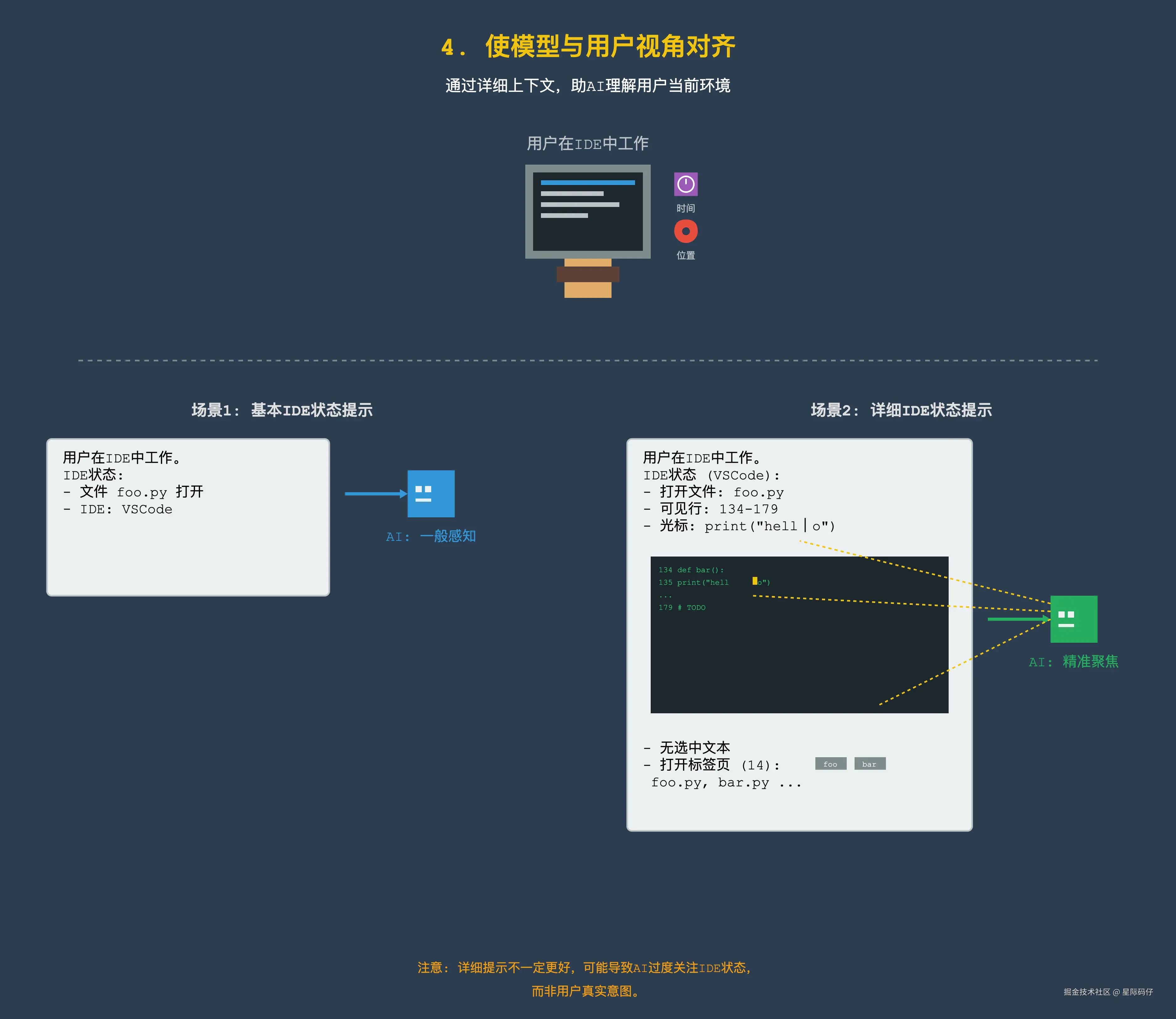 举个例子: 当用户在集成开发环境(IDE)中工作时,我们可以向模型展示 IDE 状态的详细视图。这个视图应该重点突出那些用户最可能关心,或者最可能在指令中提及的元素。