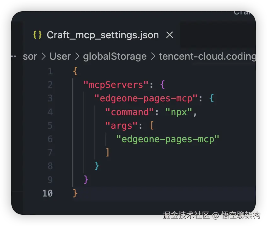 安装完成后,会在一个 Json 配置文件中生成 EdgeOne Page MCP Server 的配置。