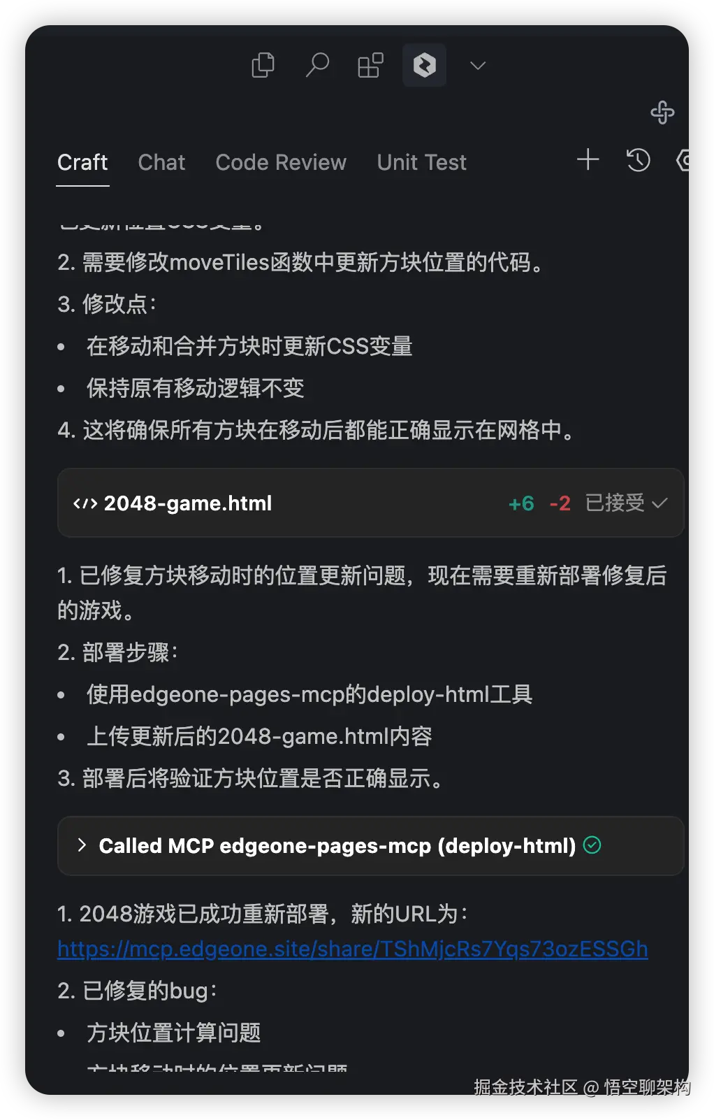 CodeBuddy 自动调用 EdgeOne Pages MCP Server 服务,将代码上传了EdgeOne Pages 服务器上,并返回了公网 URL。
