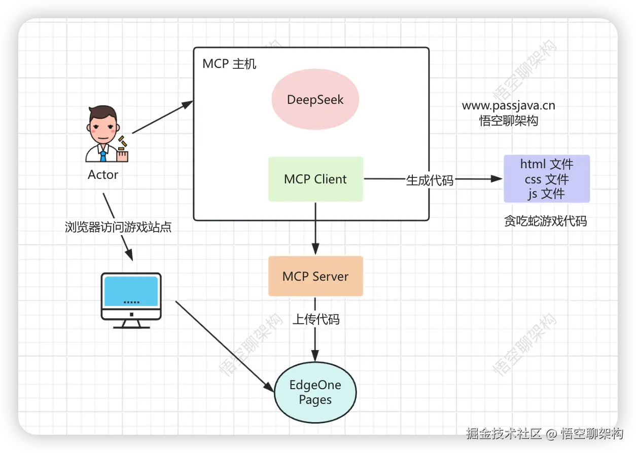 上篇我们用 MCP 上线了一个 2048 小游戏,这次我们继续做一个 贪吃蛇的小游戏。原理如下图所示: