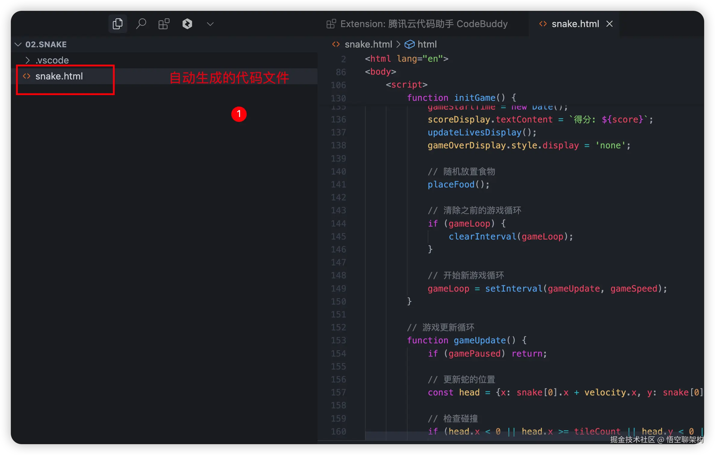 然后 CodeBuddy 就会自动生成代码文件。如下图所示: