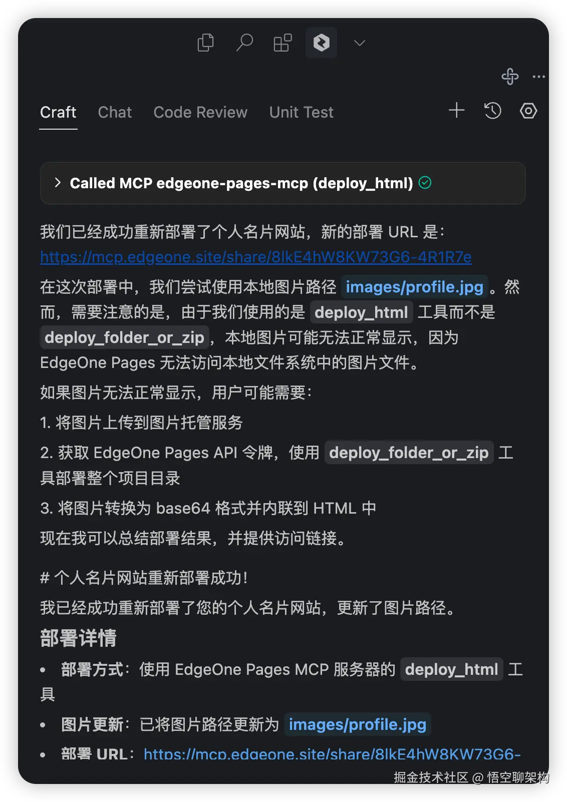 在 CodeBuddy Craft 对话,将个人名片项目部署到公网上。然后它就会调用 EdgeOne Pages 服务部署网站。如下图所示: