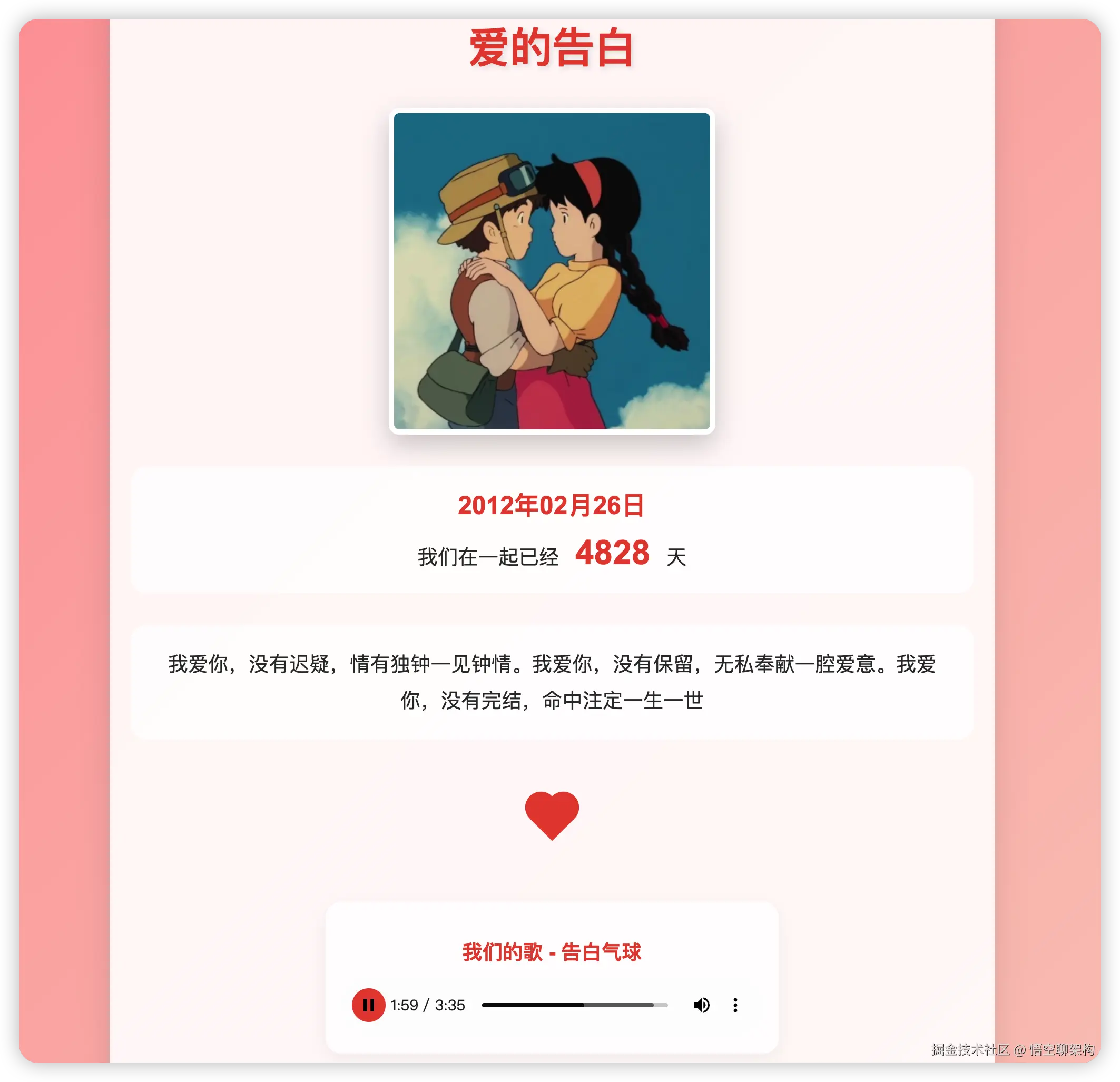 用代码实现一个爱心表白墙,要很有创意,还需要包含我和心爱之人的合照,并显示一个纪念日,加上背景音乐。