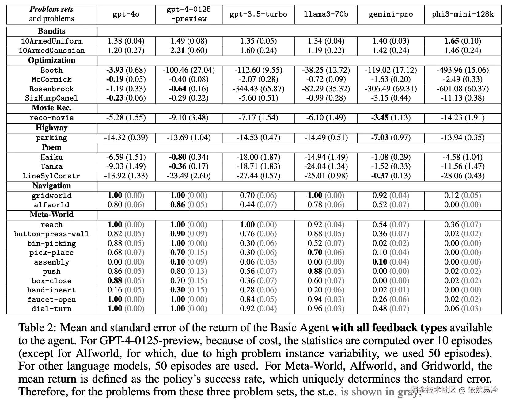 ①【表2】展示了在各类问题集(如Bandits、Optimization等多个领域)下,不同语言模型(gpt-4o、gpt-4-0125-preview等 )的Basic Agent在具备所有反馈类型时的回报均值和标准误差,不同模型在各问题集表现有差异,部分模型在某些问题集因计算成本或问题实例变异性采用不同计算episode数量 ,Meta-World、Alfworld和Gridworld中回报均值由策略成功率定义 。