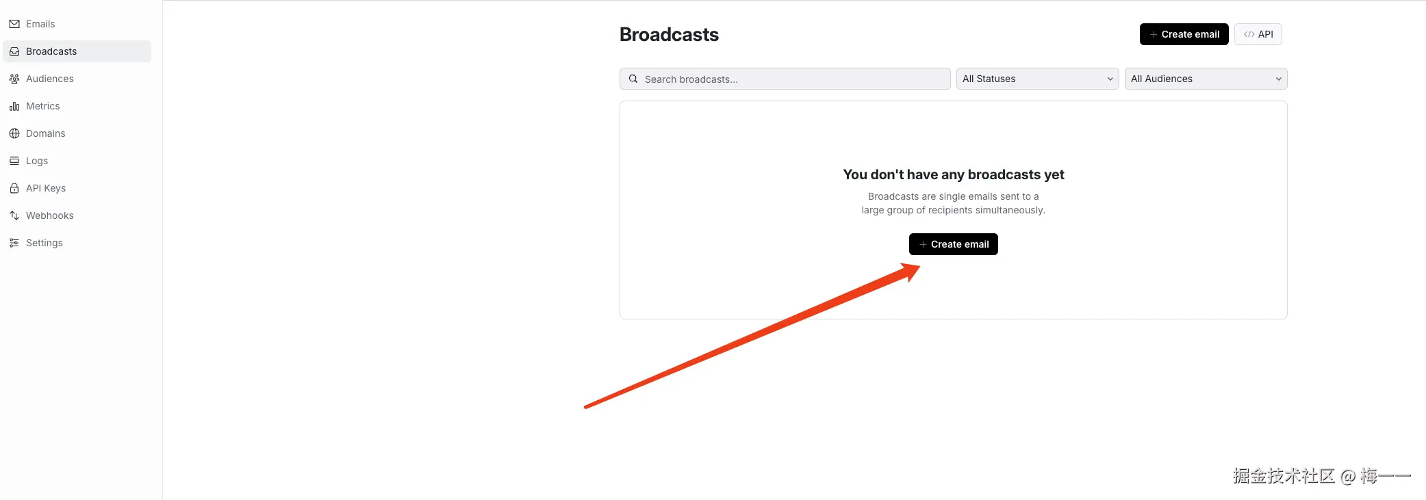 我们可以用 resend 官方的发送功能测试一下,首先点击左侧Audience菜单,也就是绑定联系人(官网用得绑定联系人,API 版本不用)