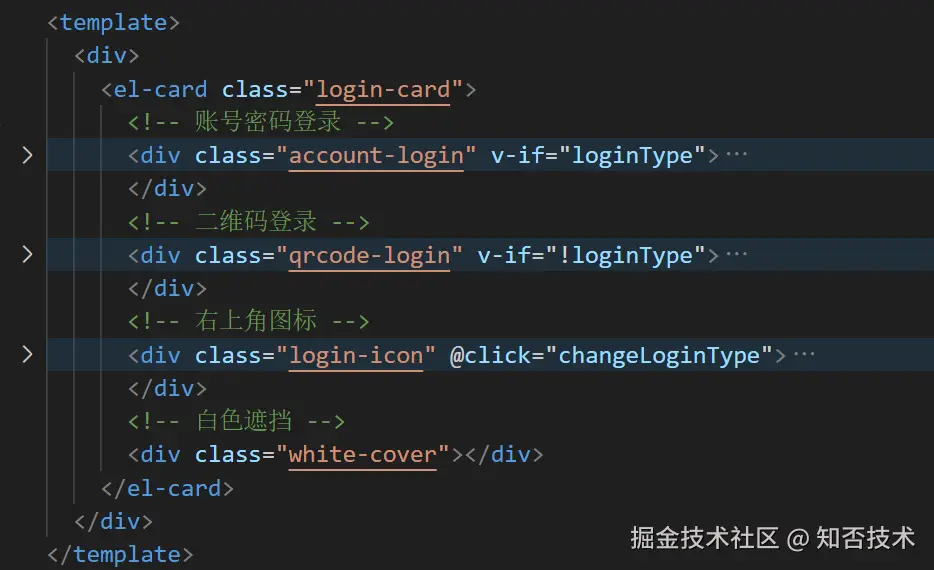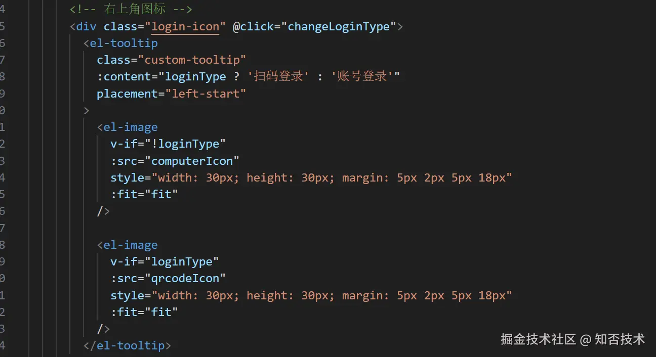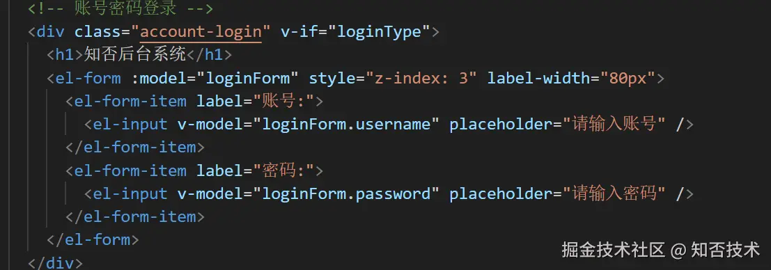 账号密码登录部分使用 el-form 组件,通过 loginType 变量控制显示隐藏。
