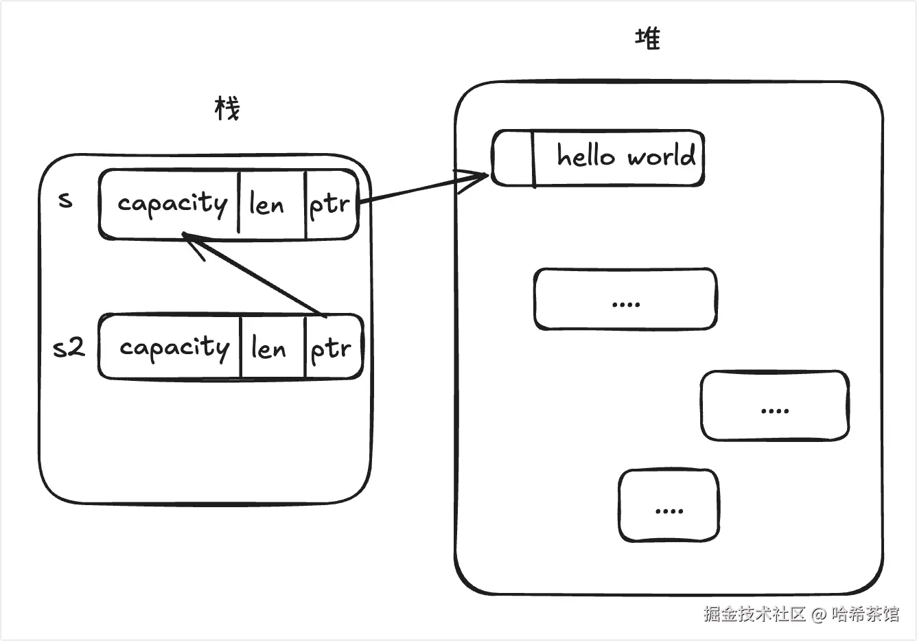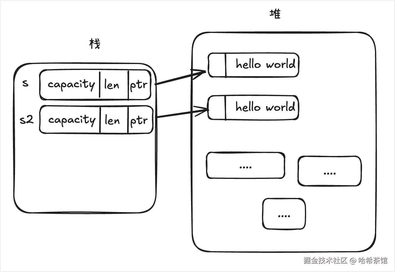 let s2 = s;执行时:- 栈上的指针信息(0x1234 + 长度 + 容量)被复制到 s2