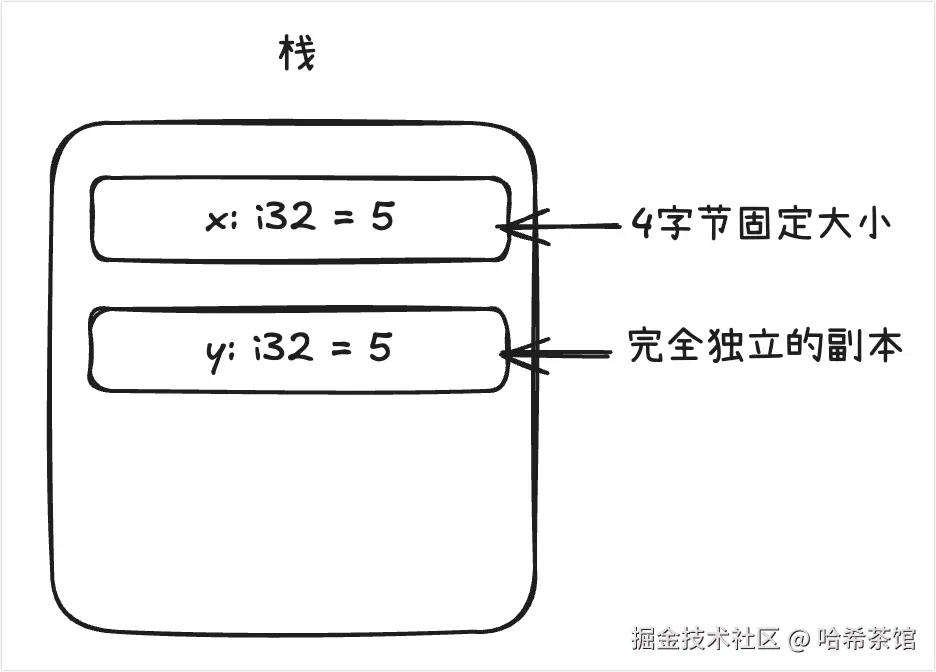 主要原因是i32 类型实现了 Copy trait,i32的存储方式和String有着本质的区别,我们先看看x和y在栈中的表现: