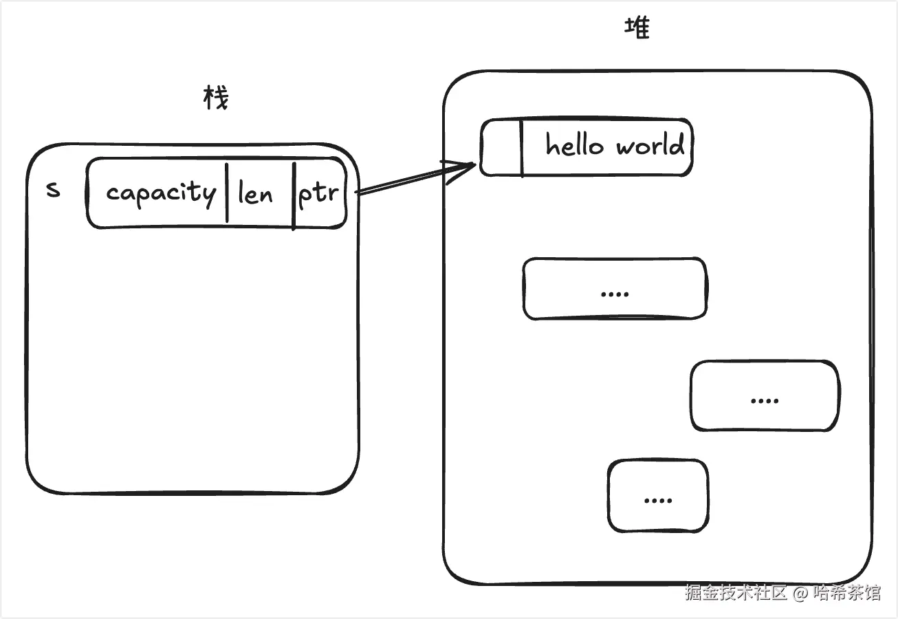 "hello world".to_string()时: - 堆中分配内存存储字符串内容(长度可能变化的动态数据)
