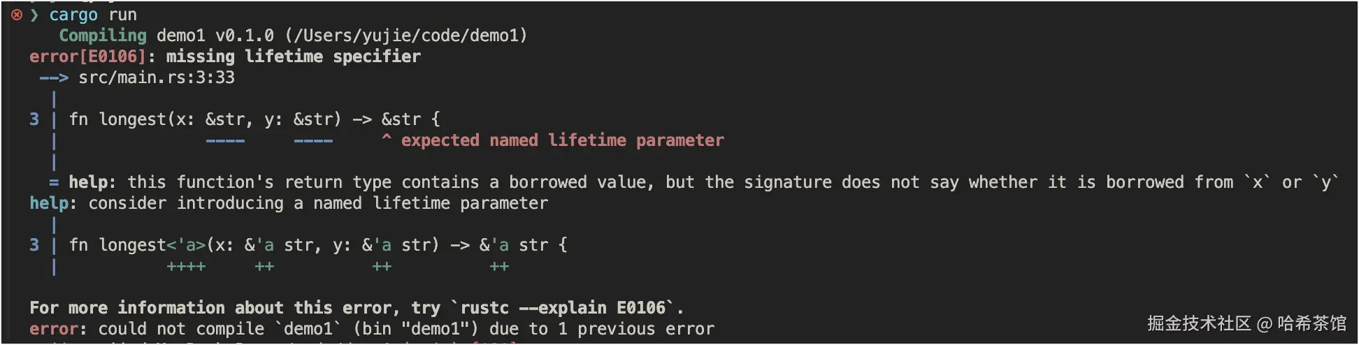 简单的说就是函数返回的引用可能指向已释放的内存(悬垂指针)。Rust 需要确保返回的引用始终有效。所以需要做如上图编译器所建议的修改,修改完后,编译器就会知道返回值的生命周期取两个参数中较短的那个。这么一说,你可能还是没有明白是怎么回事,我们再来看看这段代码: