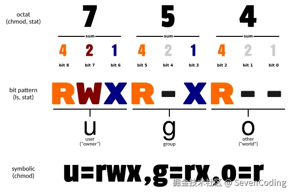 - 所有者的权限用数字表达:属主的那三个权限位的数字加起来的总和。如 rwx ,也就是 4+2+1 ,应该是 7。