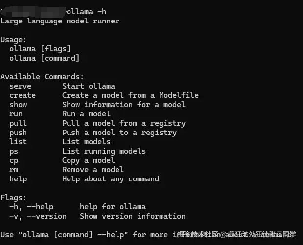 下载完成后,可以运行 ollama -h 查看 ollama 是否安装成功 (如果有提示则说明已经安装成功了)