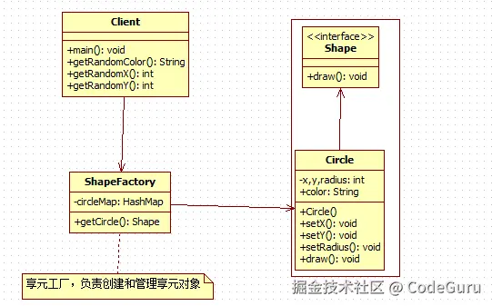 ShapeFactory 有一个 Circle 的 HashMap,其中键名为 Circle 对象的颜色。无论何时接收到请求,都会创建一个特定颜色的圆。ShapeFactory 检查它的 HashMap 中的 circle 对象,如果找到 Circle 对象,则返回该对象,否则将创建一个存储在 hashmap 中以备后续使用的新对象,并把该对象返回到客户端。
