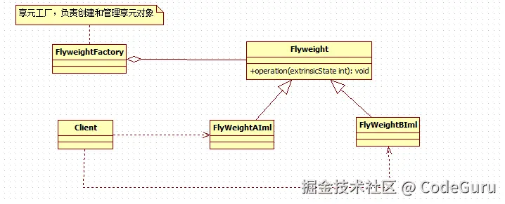 享元工厂类负责创建和管理享元对象。当一个客户端对象请求一个享元对象的时候,享元工厂需要检查系统中是否已经有一个符合要求的享元对象,如果已经有了,享元工厂角色就应当提供这个已有的享元对象;如果系统中没有适当的享元对象的话,享元工厂角色就应当创建一个新的合适的享元对象。