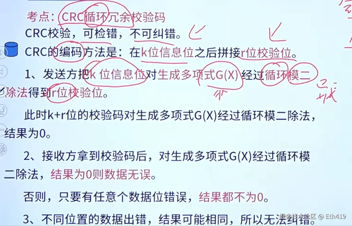 特点:可检测错误,不可纠错,使用循环模2运算法。运算后结果为0就没有错误