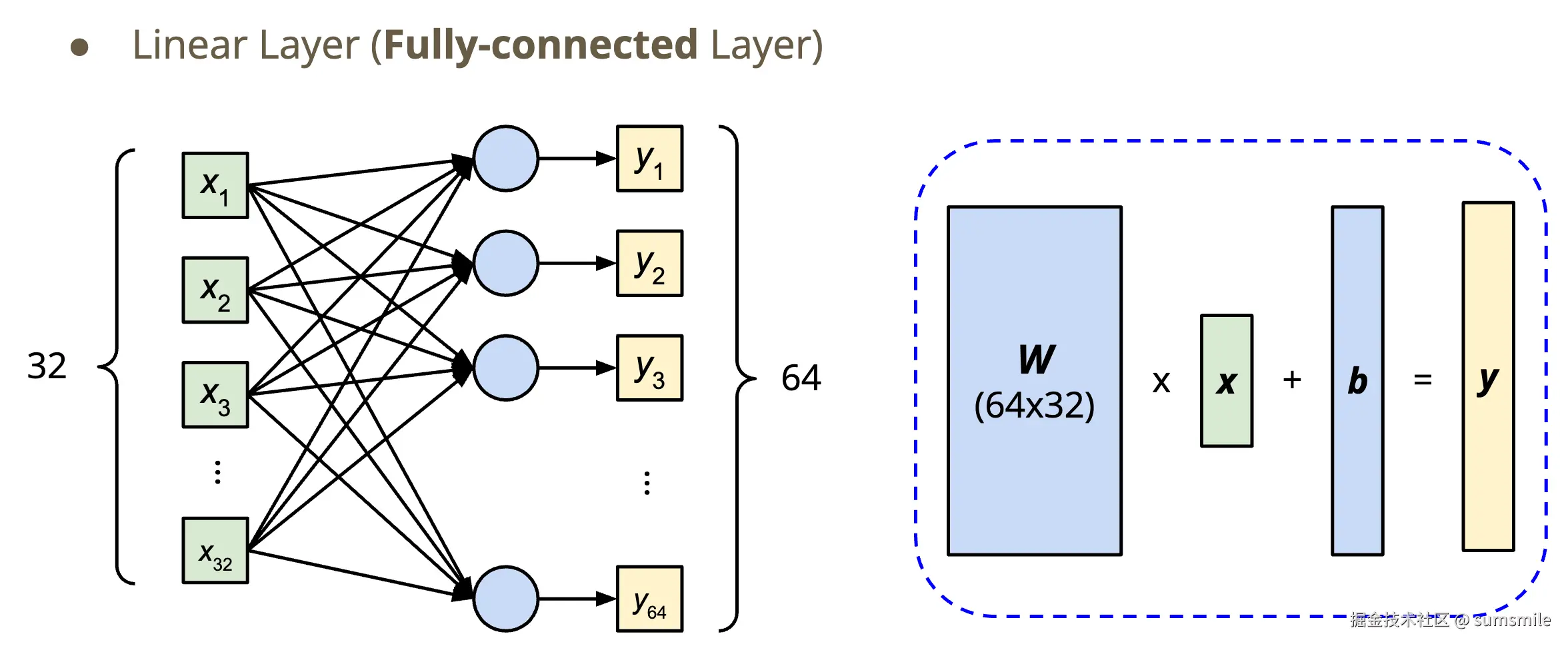 如果某个线性层input是32个参数,output是64个参数,则整个链路如下(注意,实际在torch框架中输入input X是行向量,权重W是转置后再右乘,即下图中W 和X互换位置):