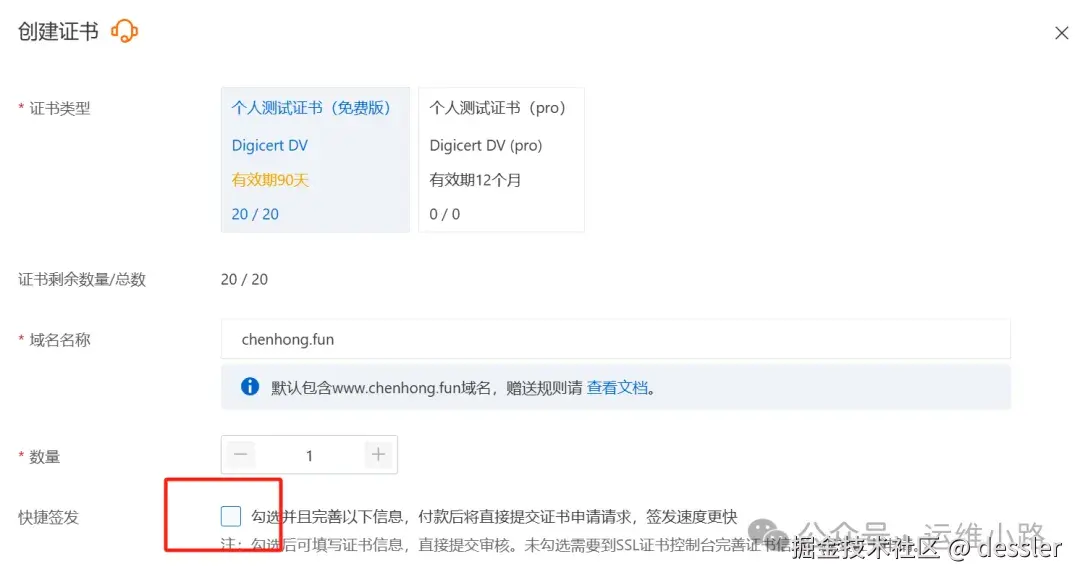 如果未快速申请,就要在后面手工验证域名dns请求(未验证之前不会签发证书)。