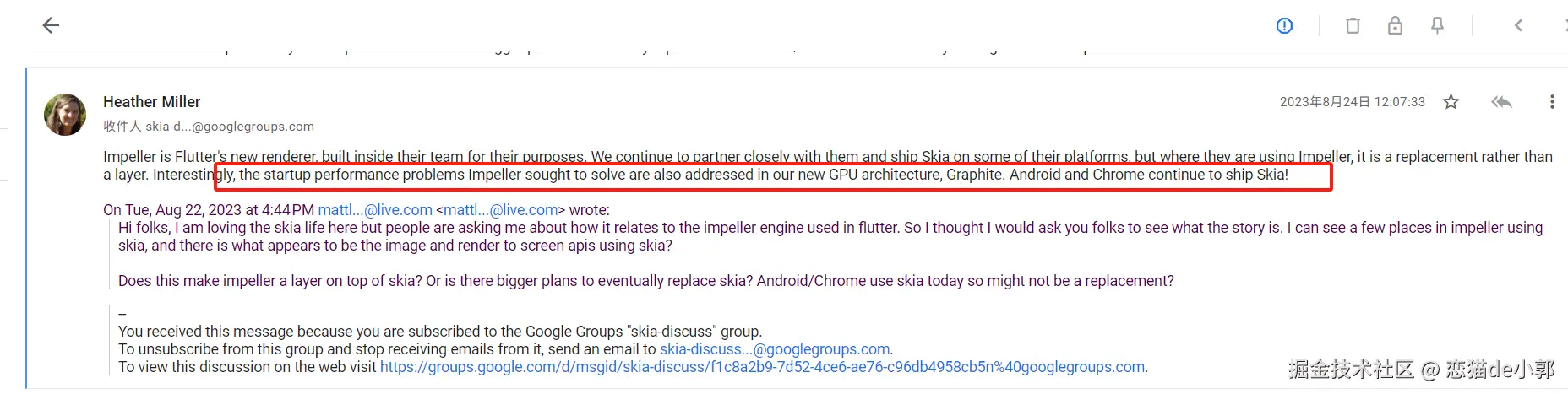 对了,最后提一句,Skia 和 Impeller 其实都是 Google 的,就像前面说的,它们之间是合作关系,对于 Graphite ,它是以 Impeller 为模型的 Skia 后端改进。
