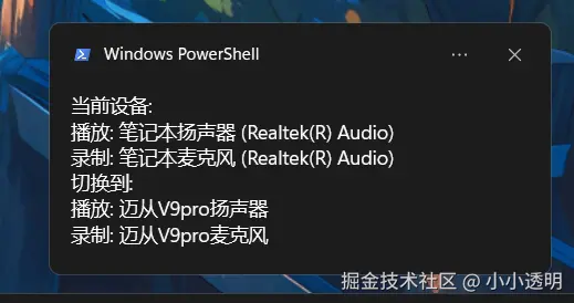 $message = "当前设备:`n播放: $currentPlayback`n录制: $currentRecording`n切换到:`n播放: $switchToSpeaker`n录制: $switchToMic"
