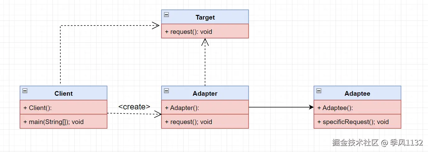 类适配器是通过继承来实现适配器的,适配器继承自需要适配的类,并实现目标接口。需要注意的是,这种实现方法需要重写需要适配的类中的方法,类图如下: