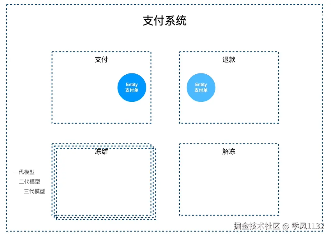 举个例子,在支付系统中存在支付与退款的业务逻辑,这两个业务逻辑都要使用支付单这个模型,在传统的开发中这两个业务逻辑会共享一个支付单模型这会导致单个模型的复杂度直线上升(因为这个模型要满足很多业务逻辑),而且当业务逻辑产生差异时,这种单模型问题会更多,在DDD中推崇模型分解的方式,不同的问题域应当使用不同的模型