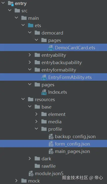 建议根据实际使用场景命名卡片名称,ArkTS卡片创建完成后,工程中会新增如下卡片相关文件:卡片生命周期管理文件(EntryFormAbility.ets)、卡片页面文件(DemoCardCard.ets)和卡片配置文件(form_config.json)。