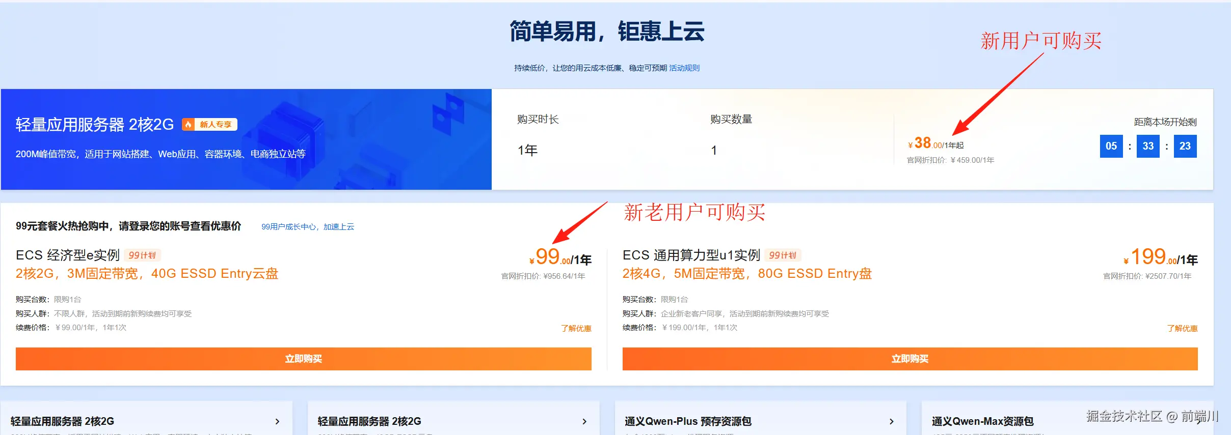 推荐从阿里云购买,新用户可购买上面38元一年的,老用户也可以购买99元一年的,都相当划算,具体可以根据自己需求按配置购买