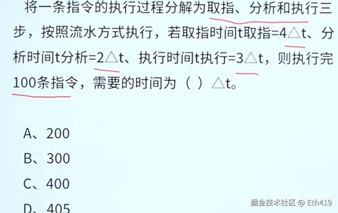时间是 第一条指令时间加上步骤最长时间*(指令数-1)=(4+3+2)+4t*(100-1)=405