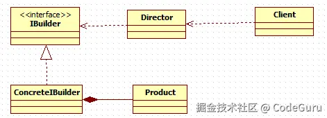 - 2 ConcreteBuilder: 实现Builder的接口以构造和装配该产品的各个部件,定义并明确它所创建的表示,并 提供一个检索产品的接口。